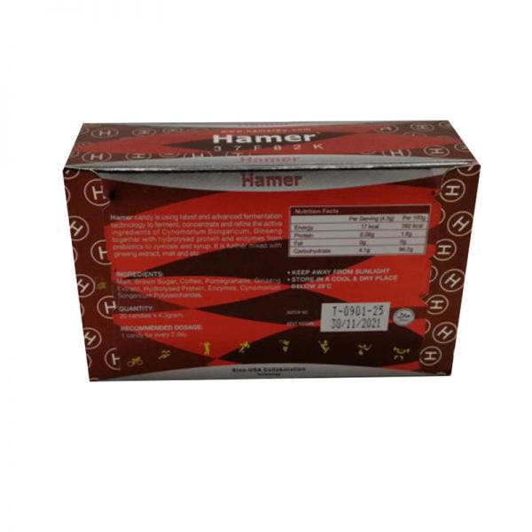 汗馬糖(Hamer candy)歷經15年研發而成,主要成分為鎖陽、人參,主要功效是補益陽氣,養筋健骨,補氣養血,緩解血虛型便秘,汗馬精力糖由於快速補充人體細胞營養,延緩老化進程非常有效,數年來已成為運動員首選的細胞營養產品。